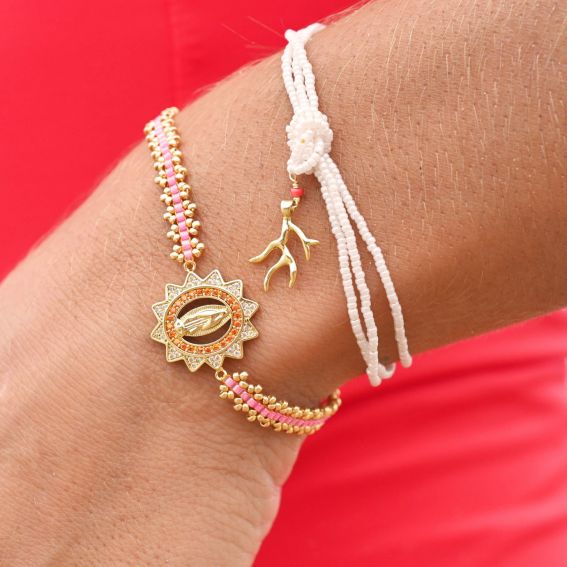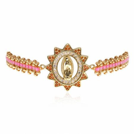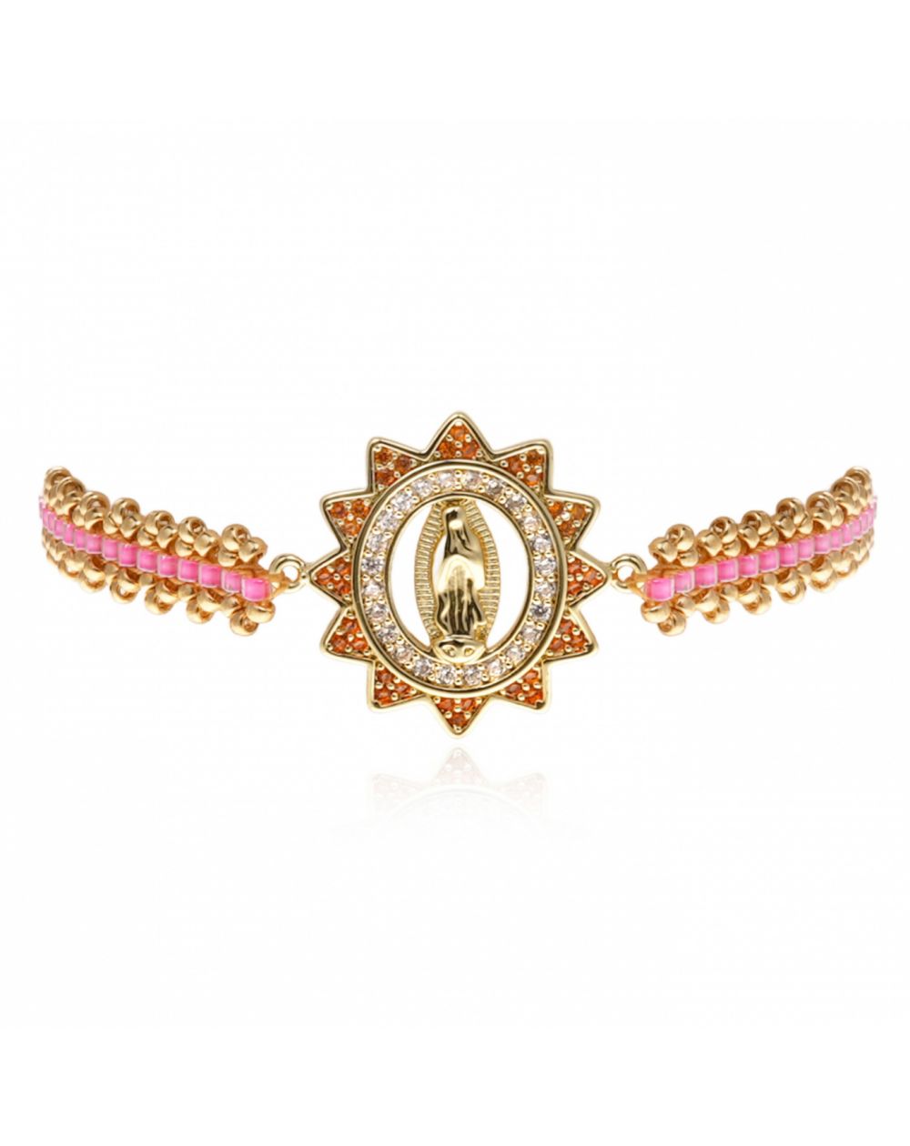 Deze armband, volledig verguld met 14-karaats goud, heeft in het midden een Wonderdadige Medaille, versierd met een afbeelding van de Heilige Maagd Maria bezet met fonkelende strass-steentjes . In de roze uitvoering tonen de stenen rondom de medaille oranjeachtige tinten die doen denken aan Madeira-citrien en kristalachtige flitsen, wat warmte en licht brengt.