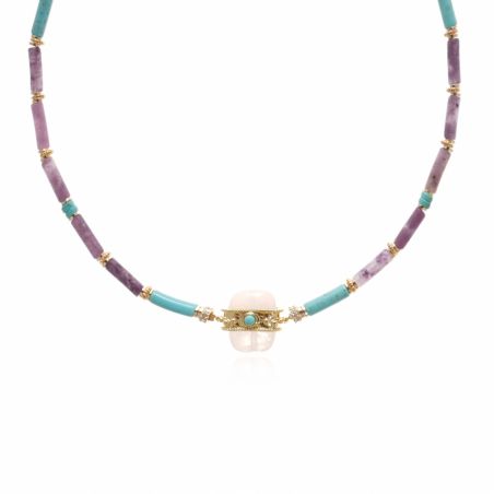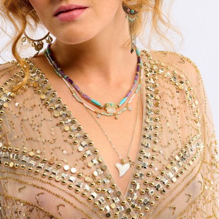 In de lila uitvoering combineert KOMBOU buisvormige kralen in tinten turkoois, amethist en goud, wat een stralend en harmonieus contrast creëert. Deze lila natuurstenen ketting voor dames kan alleen gedragen worden voor een gedurfde look of als set met de LOMBOK oorbellen voor een elegante zomerse uitstraling.