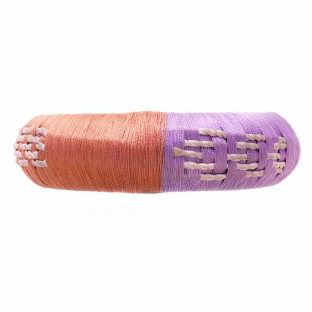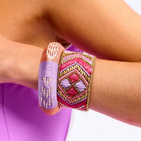 De royaal afgeronde basis zorgt voor een gestructureerd en comfortabel silhouet om de pols. Deze volledig handgeweven, roze armband voor dames combineert poederroze en lila draden tot een subtiel grafisch patroon in een touwachtig materiaal.