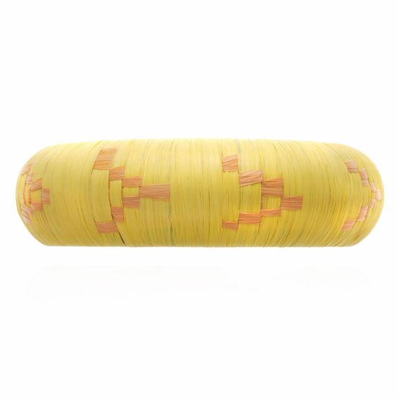 De royaal gevormde basis zorgt voor een gestructureerd en comfortabel silhouet. Deze volledig handgeweven citroengele armband voor dames combineert levendig felgeel raffia met beige chevronpatronen, wat een modern en zonnig grafisch contrast creëert.