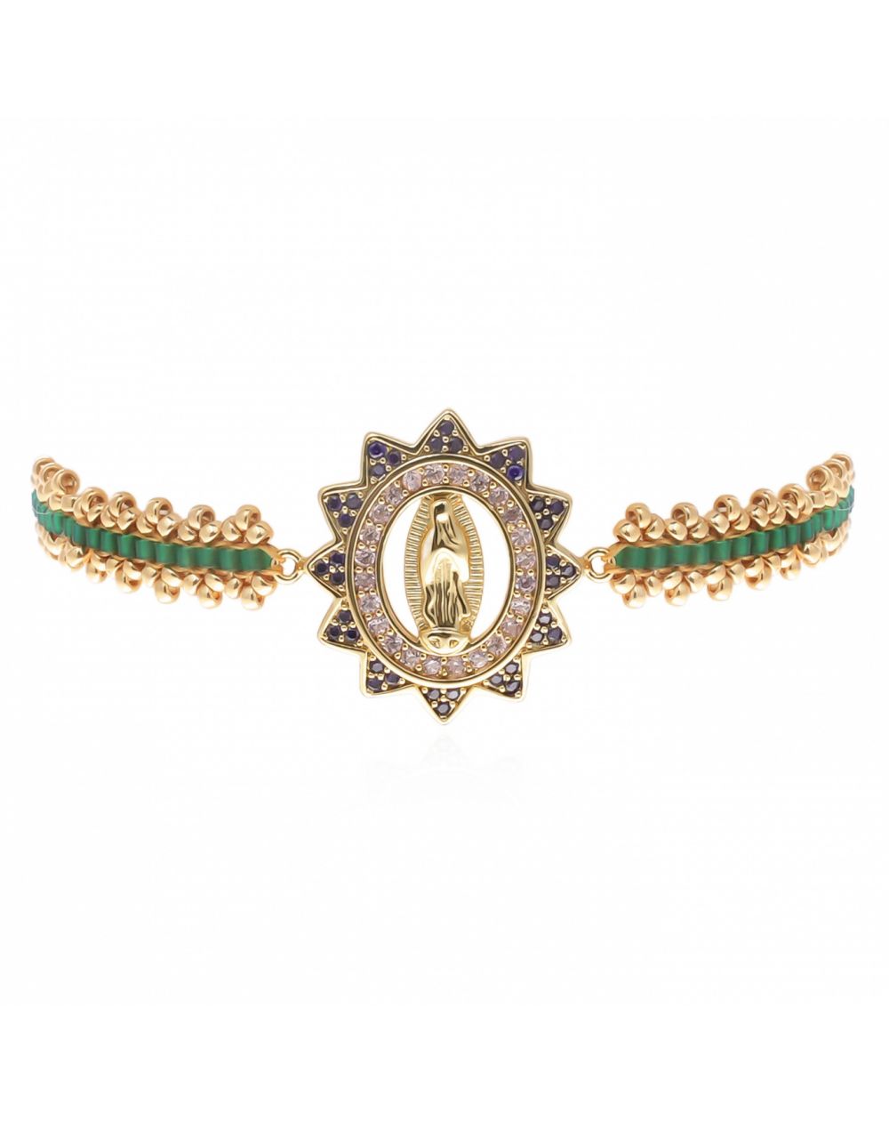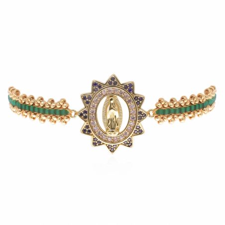 Deze armband, volledig verguld met 14-karaats goud, is voorzien van een Wonderdadige Medaille met een afbeelding van de Heilige Maagd Maria, bezet met fonkelende strass-steentjes . In deze groene uitvoering onthullen de steentjes rondom de medaille paarse tinten met een amethist-effect, wat een diep en verfijnd contrast creëert.