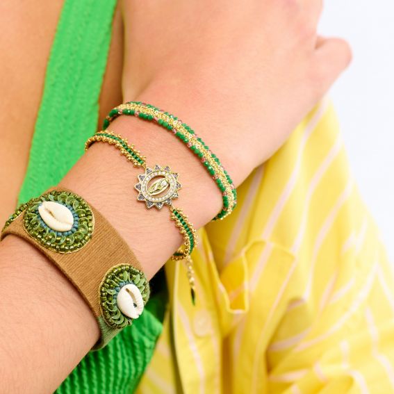 De armband is opgebouwd uit dennengroene en gouden kraaltjes , die zorgvuldig zijn geweven tot een verfijnd kantachtig effect. Deze gelukbrengende groene armband voor dames kan als elegante talisman gedragen worden, ideaal om een alledaagse outfit op te fleuren of een bohemian chique look compleet te maken.