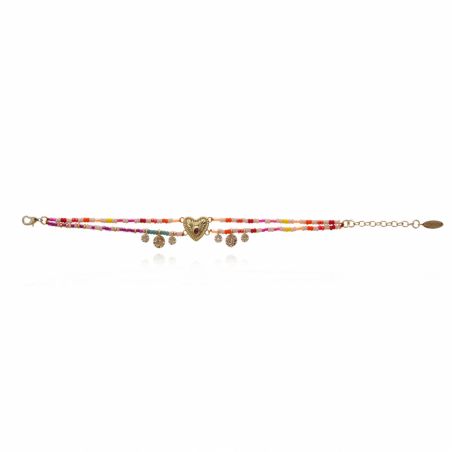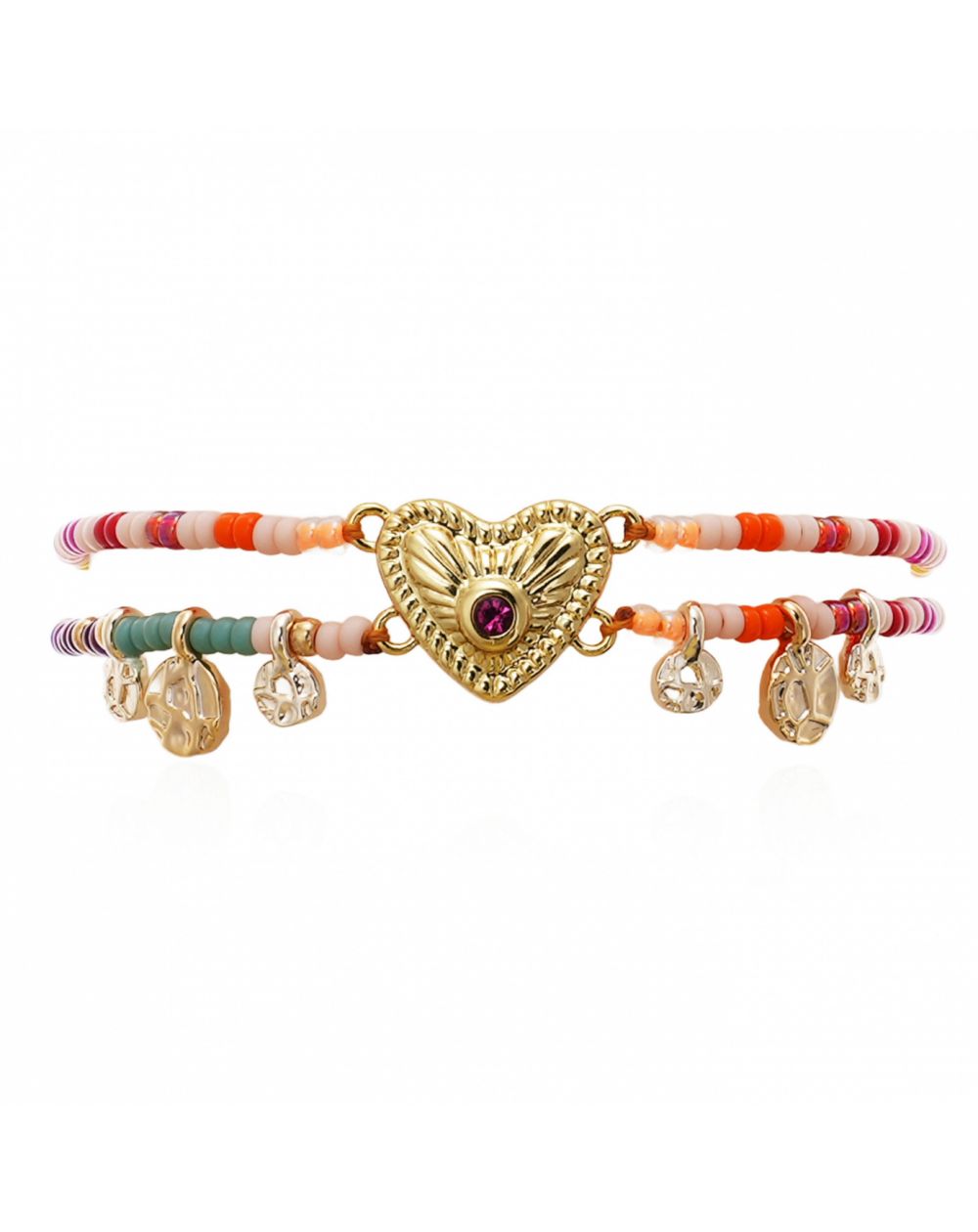 In het midden vangt een fijn bewerkte hartvormige hanger , verguld met 14-karaats goud, het licht dankzij de sprankelende turkooizen strass-steentjes. Aan weerszijden ontvouwen zich twee rijen kleurrijke kraaltjes die meebewegen op het ritme van de delicate decoratieve elementen, wat zorgt voor beweging en lichtheid.