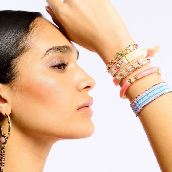In deze blauwe uitvoering combineert MACANOS tinten intens kobaltblauw, poederroze, lila en goud, wat resulteert in een stralende en harmonieuze compositie. Deze kobaltblauwe damesarmband kan als statement piece alleen gedragen worden of gecombineerd met andere armbanden voor een gedurfde zomerlook.