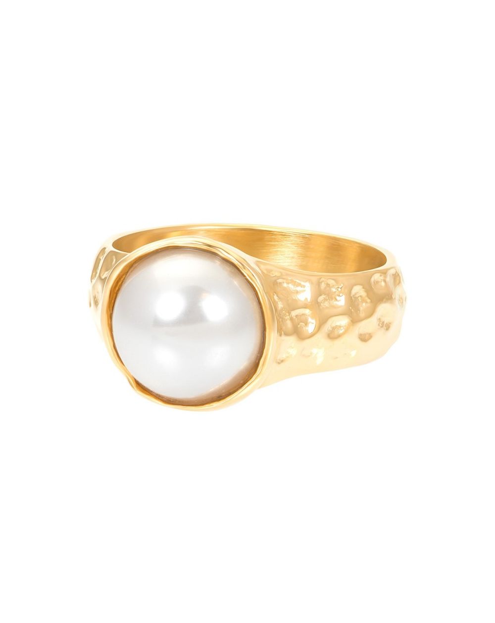 Deze ring valt op door zijn onderscheidend karakter en moderne elegantie. Perfect om elke outfit te verfraaien, hij combineert op harmonieuze wijze goudkleurig staal en witte parel om een opvallend en verfijnd contrast te creëren