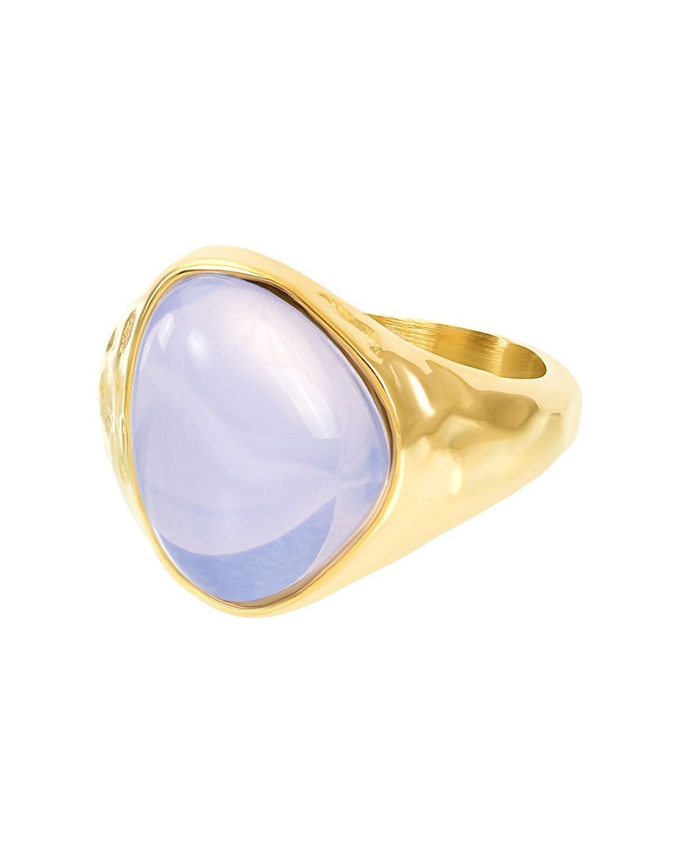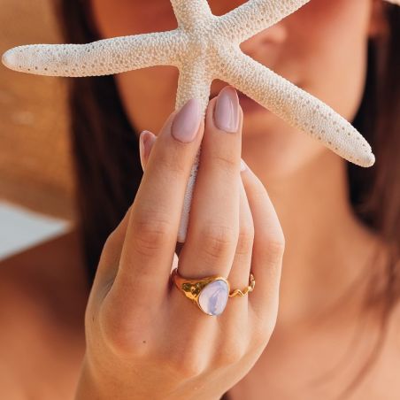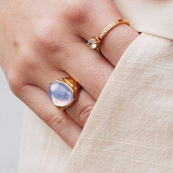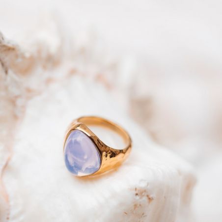 Deze ring valt op door zijn moderne uitstraling en zijn vleugje mysterie. Perfect om elke outfit te verfraaien, hij combineert op harmonieuze wijze goudkleurig staal en opalen steen om een elegant en betoverend contrast te creëren.