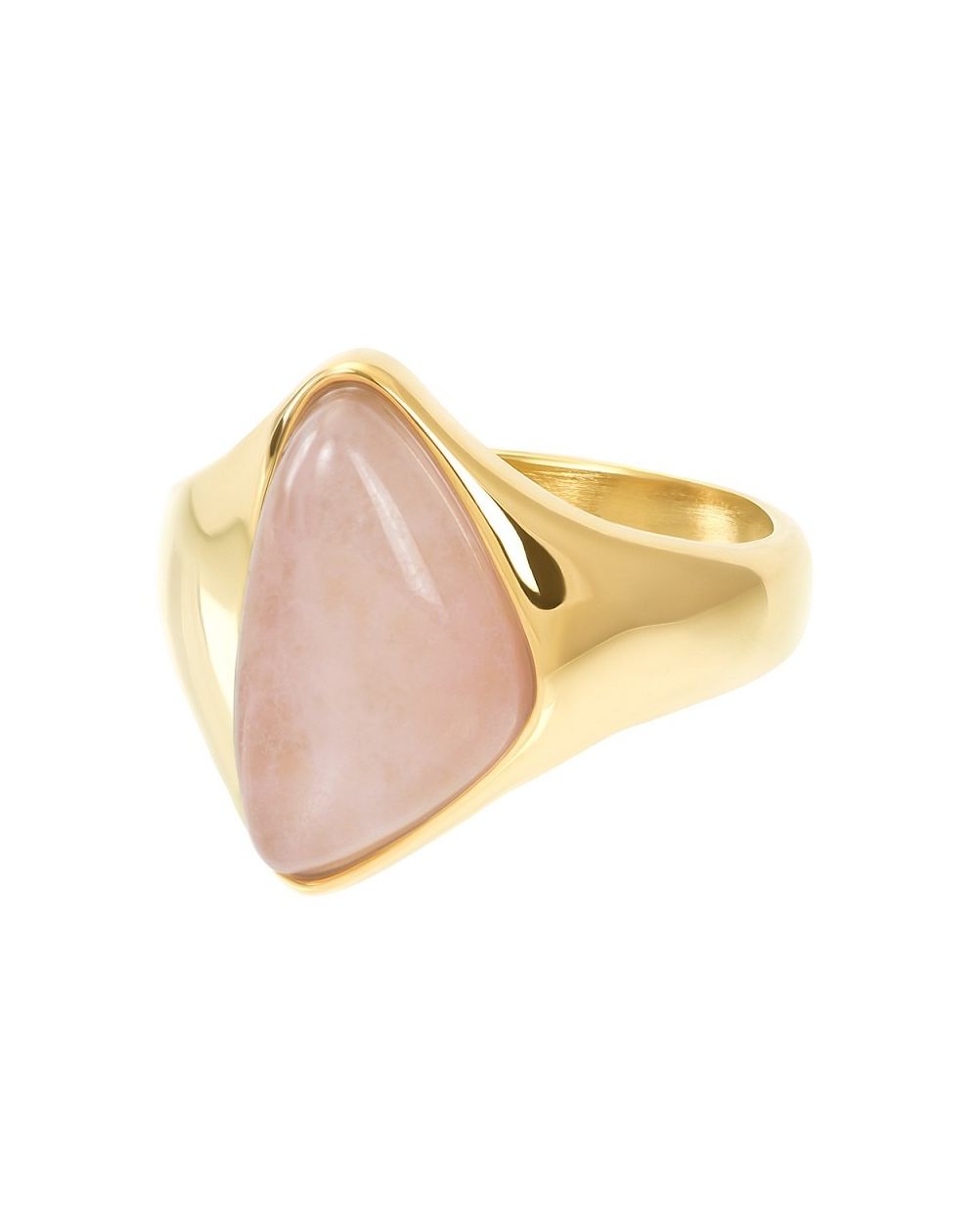 Deze ring valt op door zijn elegante ontwerp en zachte kleuraccent, ideaal om een vleugje verfijning toe te voegen aan elke outfit. De combinatie van verguld staal en rozenkwarts zorgt voor een harmonieus en aantrekkelijk contrast