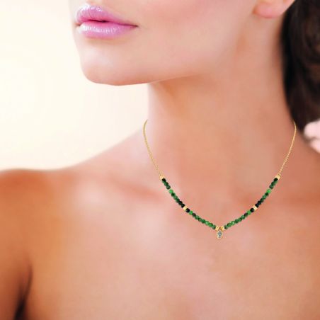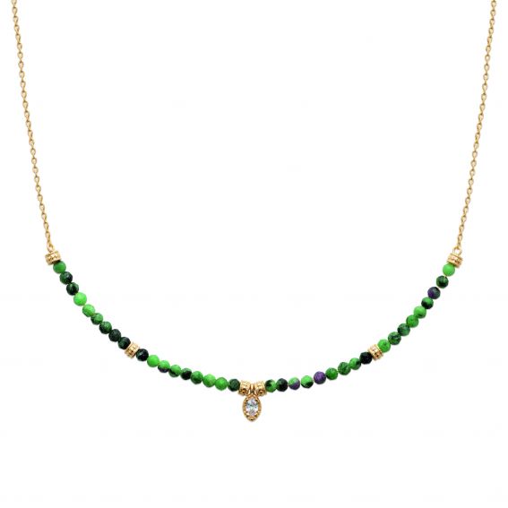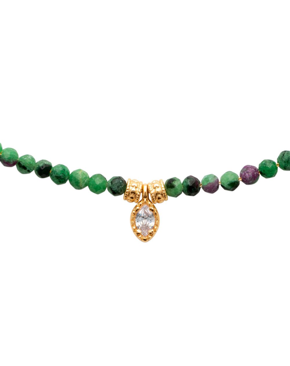 Deze ketting is gemaakt van robijnrode zoisiet kralen, met natuurlijke groene en fuchsia tinten, afgewisseld met kleine gouden elementen. In het midden zorgt een gouden bedel versierd met kristallen voor een vleugje sprankeling.