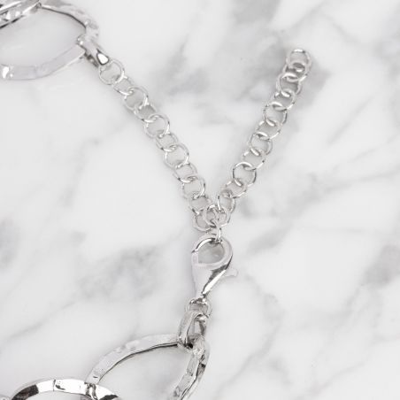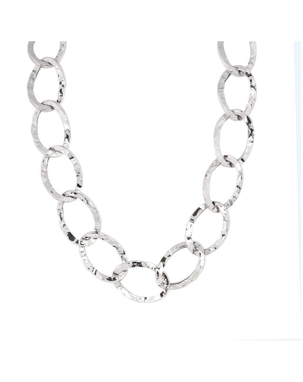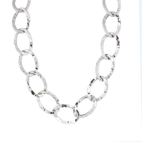 Dit dames collier is een collier met gehamerde schakels. Het gaas is 17 mm breed en 23 mm lang.