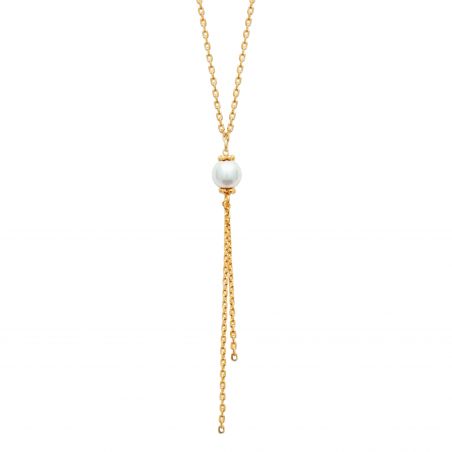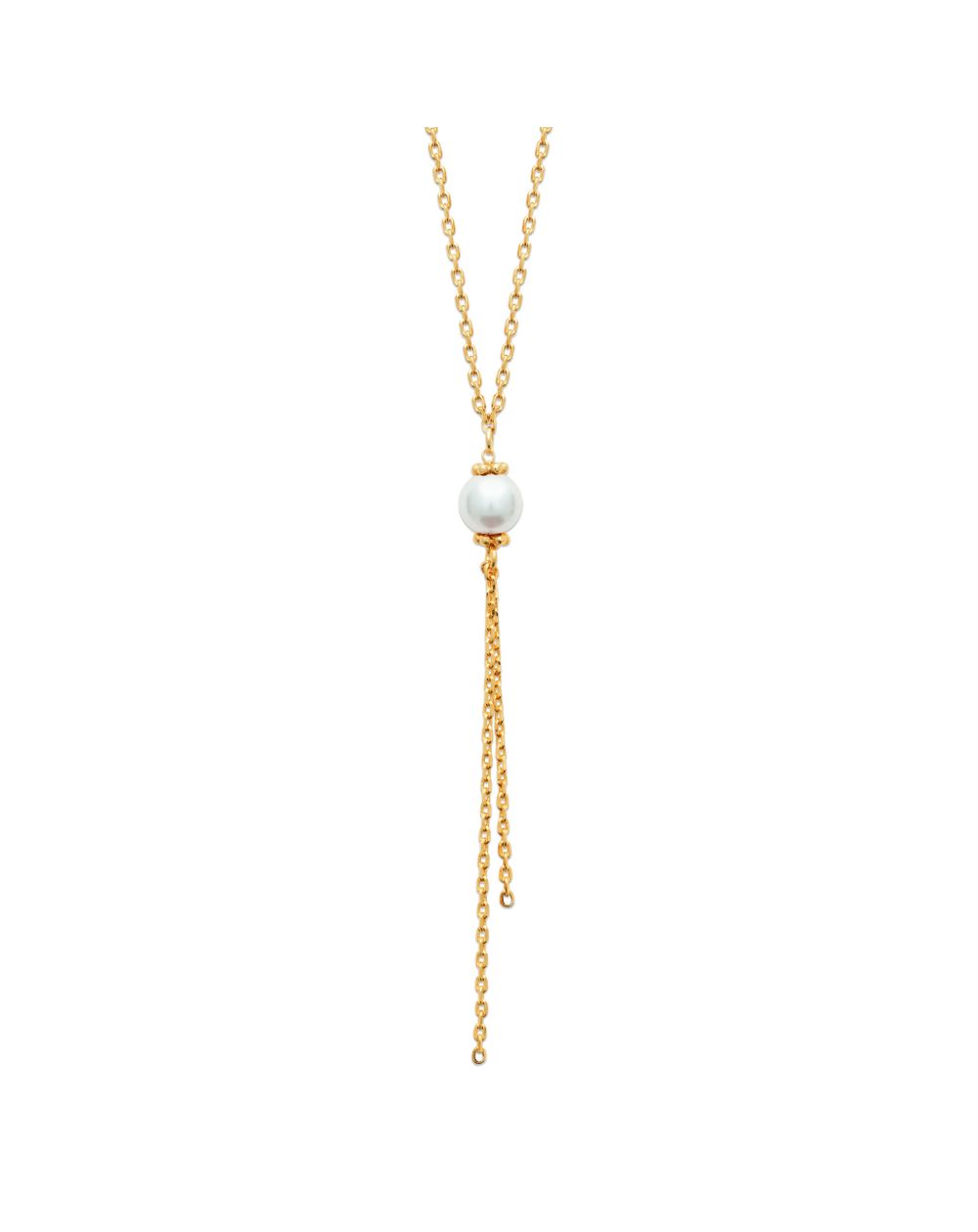 Dit is een mooie vergulde ketting met een delicate ketting en een enkele parel, afgewerkt met een kettingkwastje. Heel elegant.
