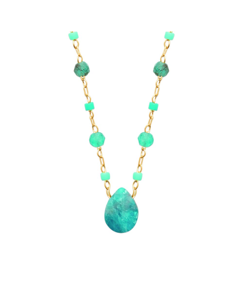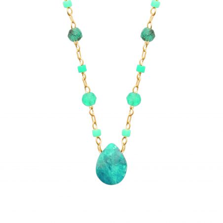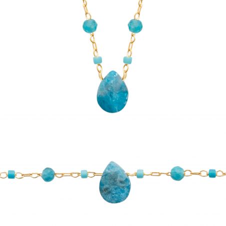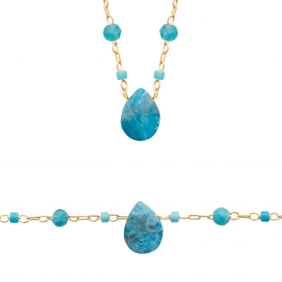 Deze vergulde ketting is prachtig versierd met apatietkralen en een druppelvormige hanger. Groene kralen en gouden schakels creëren een elegant en harmonieus contrast en voegen een vleugje heldere, natuurlijke kleur toe aan uw stijl. De apatiethanger, met zijn unieke tint en delicate vorm, is het middelpunt van deze sieraden. Perfect om een dagelijkse outfit of voor speciale gelegenheden te verfraaien, deze ketting combineert verfijning en originaliteit. Het is ook een ideaal cadeau voor een speciaal iemand en toont uw genegenheid met elegantie en stijl.