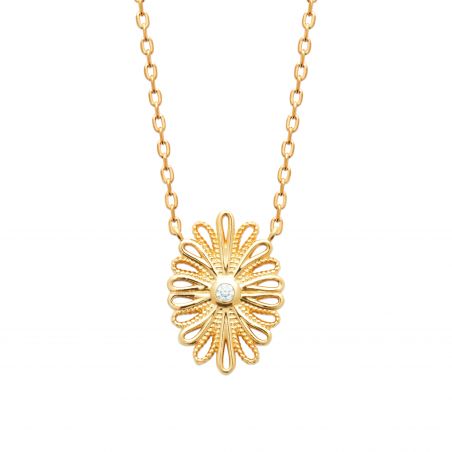 Deze vergulde ketting is discreet elegant met zijn delicate ontwerp. Het heeft een fijne ketting en een centraal opengewerkt motief in de vorm van een bloem of zon, wat een vleugje subtiele elegantie toevoegt. Deze armband is perfect voor een minimalistische en verfijnde look en kan alleen of in combinatie met andere kettingen worden gedragen.