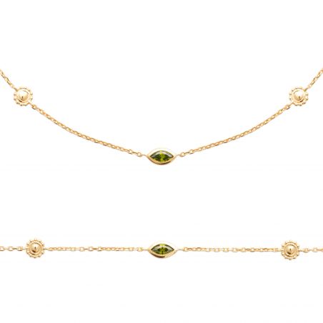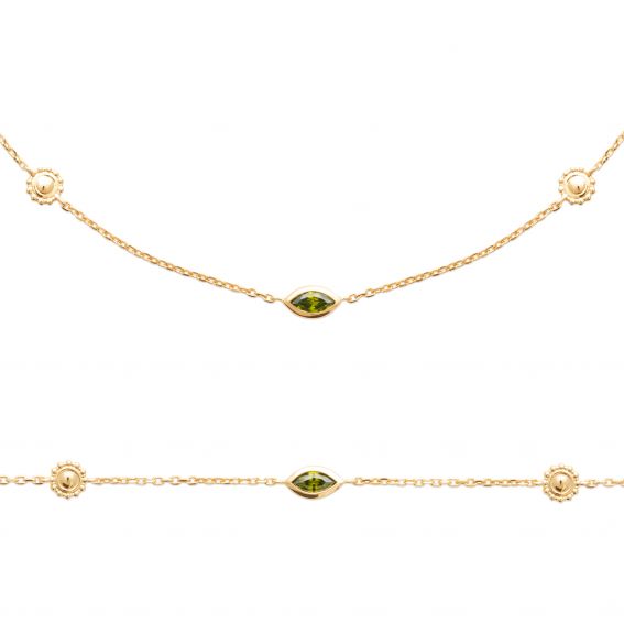 Deze vergulde ketting onderscheidt zich door zijn finesse en discrete elegantie. Het heeft een heldergroene, marquise-vormige middensteen, die subtiel omlijst is aan de ketting. Aan weerszijden van de centrale steen voegen twee reliëfontwerpen een vleugje subtiel ornament toe. De fijne ketting benadrukt de schoonheid van de steen en patronen, waardoor een verfijnd, minimalistisch sieraad ontstaat, perfect voor een alledaagse look of als aanvulling op een geklede outfit.