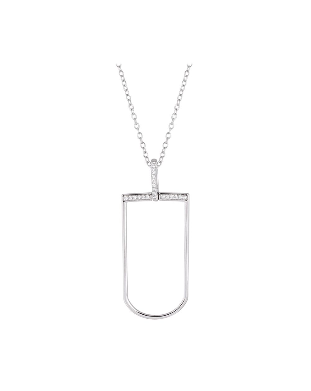 Deze zilveren damesketting is een ketting met een U-vormige hanger. De hanger is bezet met zirkoniumoxidestenen en is 44 mm hoog.