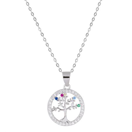 Deze ketting met gekleurde steen is een levensboomketting voor dames bezet met zirkoniumoxide stenen. De levensboomcirkel heeft een diameter van 15 mm.
