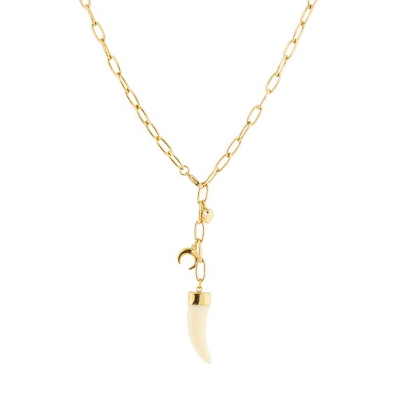 Deze stalen damesketting is een gouden ketting met een ivoorkleurige hoorn en verschillende bedels. Deze ketting kan eenvoudig op elke gewenste lengte worden aangepast.