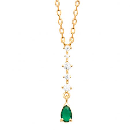 Deze damesketting is verguld met 18-karaats goud en bezet met zirkoniastenen, waarvan er één smaragdkleurig is. Deze ketting is in lengte verstelbaar van 42 tot 45 cm.