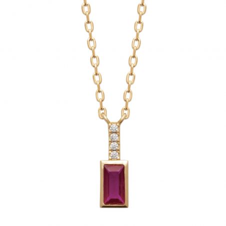 Deze 18-karaats vergulde ketting valt op door de elegante eenvoud van de hanger: een robijnrode steen, geslepen in een rechthoek, hangend aan een hangertje bezet met witte zirkonia's. Een delicate en stralende creatie die een verfijnde kleuraccent aan je halslijn geeft, ideaal voor dagelijks gebruik of om een chique outfit te accentueren.