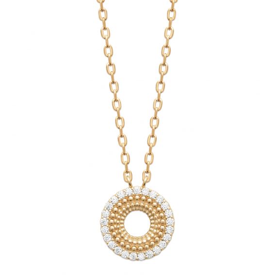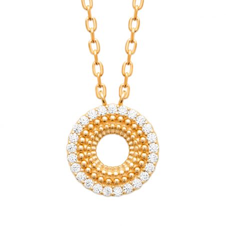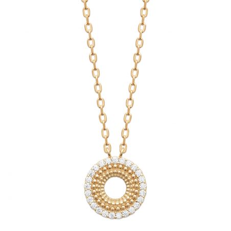 Laat je stijl stralen met de Vortex-ketting in 18-karaats vergulding , een creatie die zowel modern als verfijnd is. De fijn gestructureerde ronde hanger roept een beweging van energie en licht op, versterkt door een zetting van sprankelende zirkoniumoxiden .