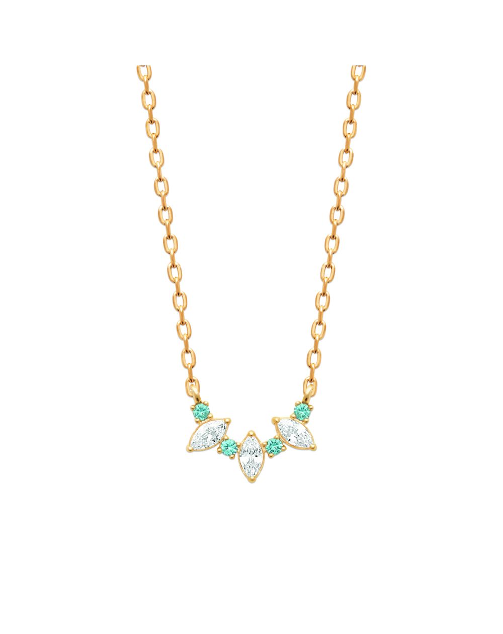 De Lyria-halsketting betovert met haar delicate elegantie en op de natuur geïnspireerde ontwerp. De fijn bewerkte hanger combineert marquise-geslepen witte zirkonen met subtiele blauwe stenen , waardoor een stralende en luchtige harmonie ontstaat die het licht op een verfijnde manier weerkaatst.
