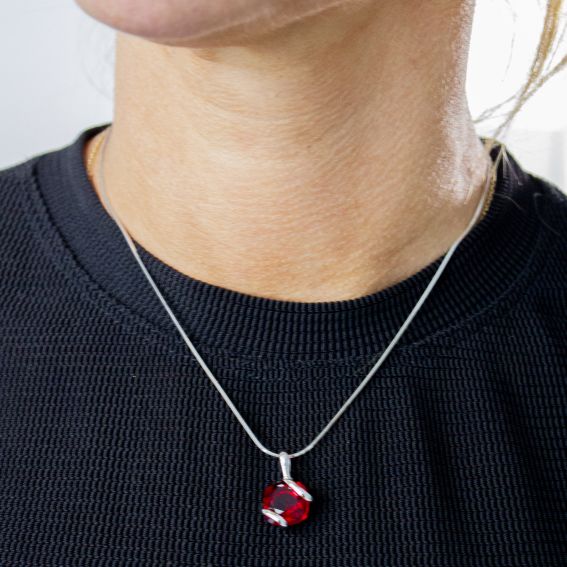 Het is samengesteld uit een rode Swarovski -steen van 12 mm aan een zijkant. De lengte van de ketting van deze ketting is 40 cm. De hanger is 22 mm hoog.