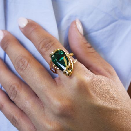 De druppelvormige, groengekleurde steen is een Swarovski-kristal van 22 mm hoog en 12 mm breed. Deze gouden ring is eenvoudig verstelbaar en past zich aan de maat van uw vinger aan.