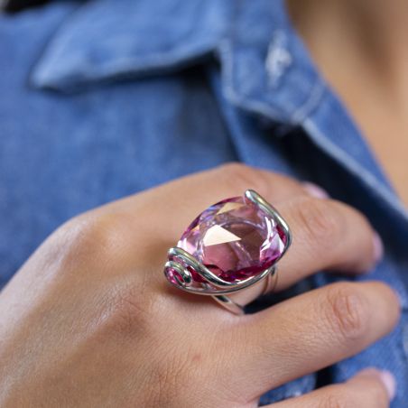 De steen is een druppelvormig Swarovski-kristal van 3 cm hoog en 2 cm breed. Deze ring is gemakkelijk verstelbaar en past zich aan de maat van je vinger aan.