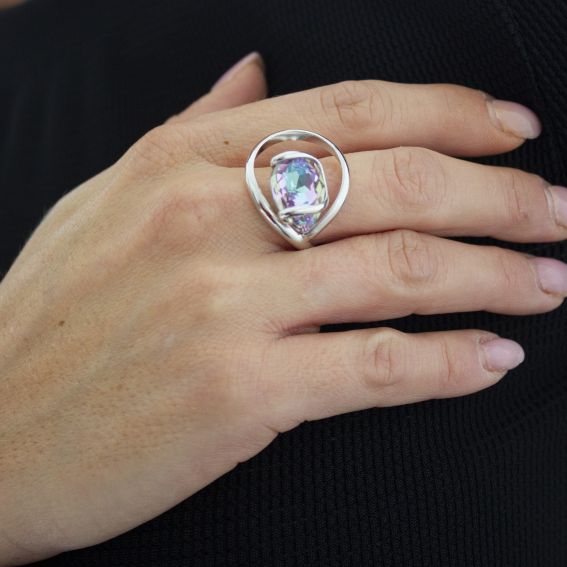 De steen is een Swarovski-kristal van 18 mm hoog en 13 mm breed . Deze ring is gemakkelijk verstelbaar en past zich aan de maat van je vinger aan.