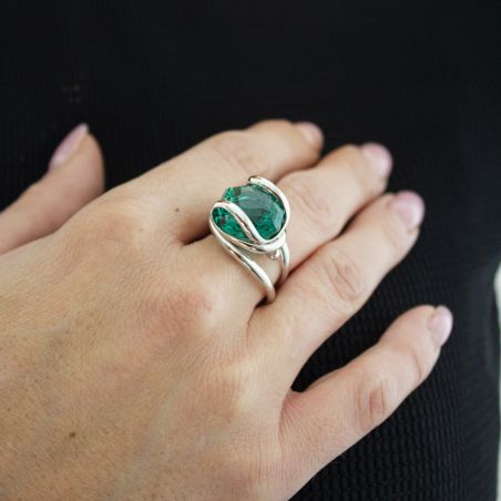 La pierre est un cristal Swarovski mesurant 38mm de haut. Cette bague est facilement réglable et s'adapte à la taille de votre doigt.