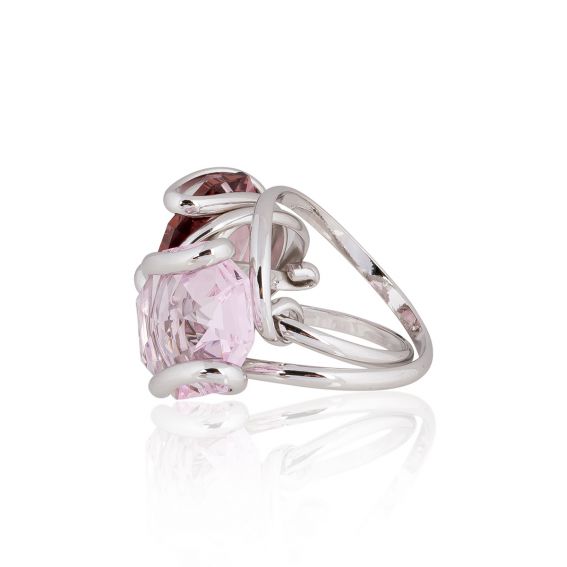 De stenen in mauve/roze tinten zijn Swarovski-kristallen met een afmeting van 14 mm aan een zijkant. Deze ring, op een zilveren zetting, is verstelbaar en past zich aan de grootte van je vinger aan.