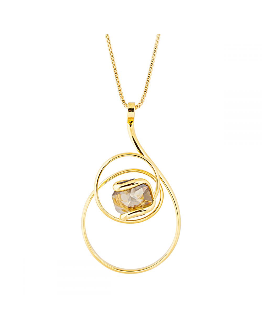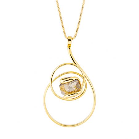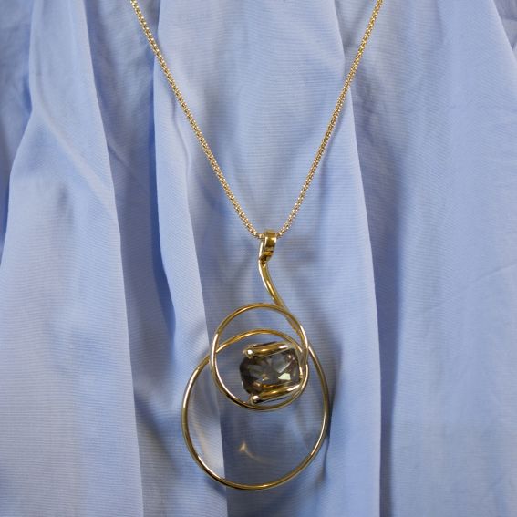 De hanger heeft een dubbel cirkelontwerp dat een achthoekig Swarovski-kristal omringt, in een 'Smoky'-tint, een subtiel en verfijnd rokerig bruin. Dit ontwerp creëert een boeiend visueel effect, waarbij het kristal harmonieus in het midden van de gouden structuur lijkt te zweven. Bovendien is de ketting in lengte verstelbaar, wat flexibiliteit biedt om aan verschillende stijlen en voorkeuren te voldoen.