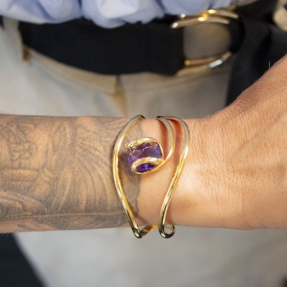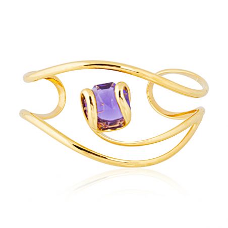 De Andrea Marazzini Octagon Smoky Gold-armband is een opmerkelijk stuk dat luxe en moderniteit combineert. Dit gouden sieraad valt op door zijn unieke ontwerp, met een Swarovski-kristal in een achthoekige vorm. De centrale steen, in een subtiele rokerige paarse tint, is zorgvuldig geplaatst in een vloeiende en elegante gouden structuur.