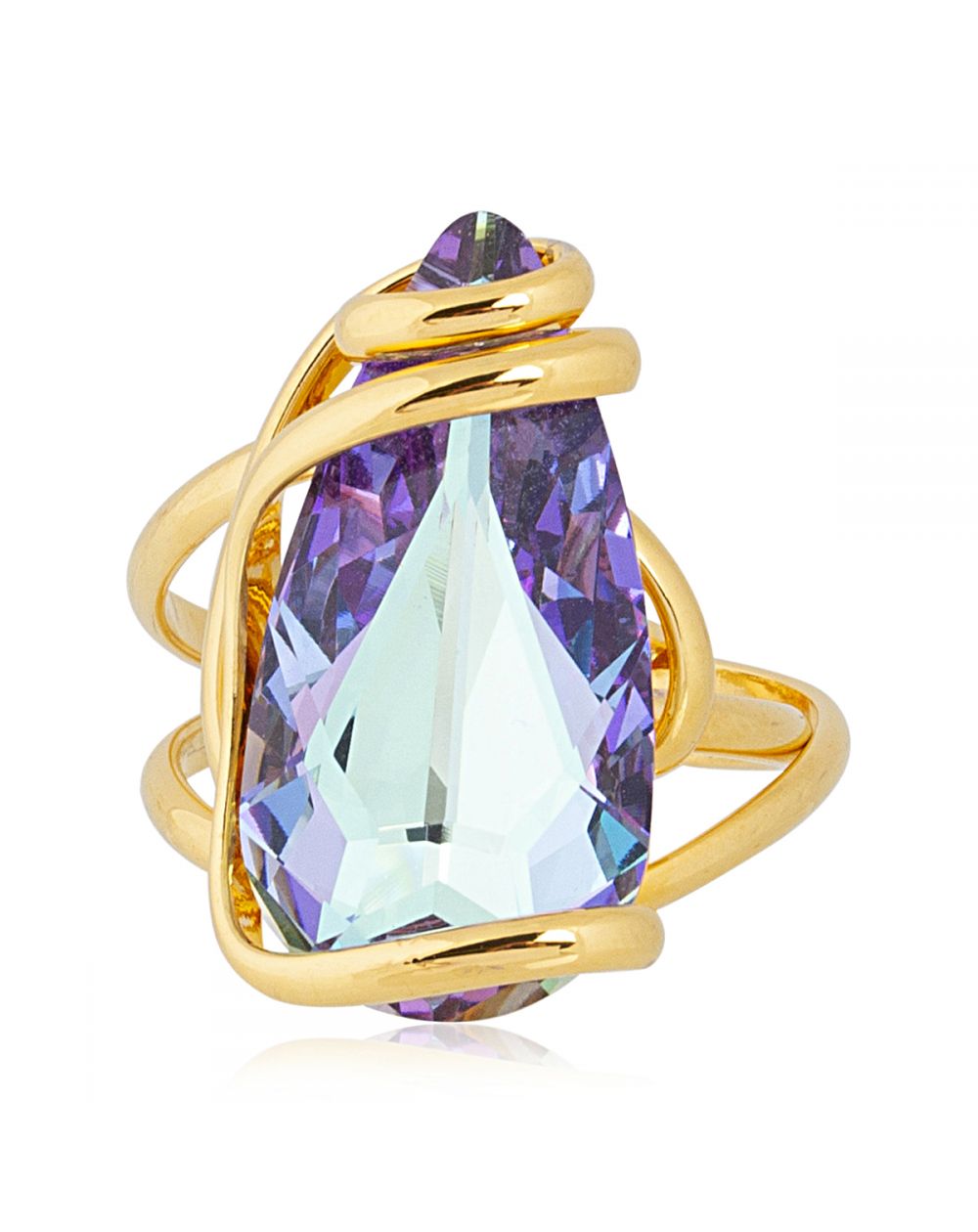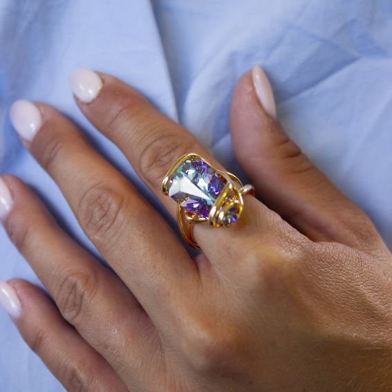 Verlicht uw stijl met deze weelderige Swarovski Andrea Marazzini Elegant Vitral Light-ring . Versierd met een officieel Swarovski-kristal van 24 mm hoog, is deze gouden ring een waar juweel van licht. Het kristal, met boeiende veelkleurige reflecties, onthult tinten variërend van paars tot groen, waardoor een vleugje magie en elegantie in uw hand komt.