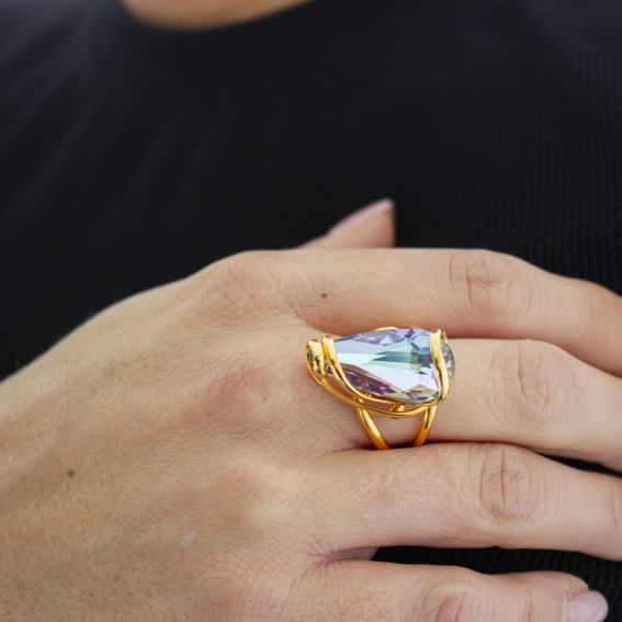 Het fijn vervaardigde gouden frame omhult het kristal sierlijk en creëert een perfecte balans tussen moderniteit en verfijning. Deze Swarovski-ring is ideaal voor wie op zoek is naar een accessoire dat zowel chic als onderscheidend is, dat een avondoutfit kan verfraaien of een verfijnde noot aan een alledaagse look kan geven.