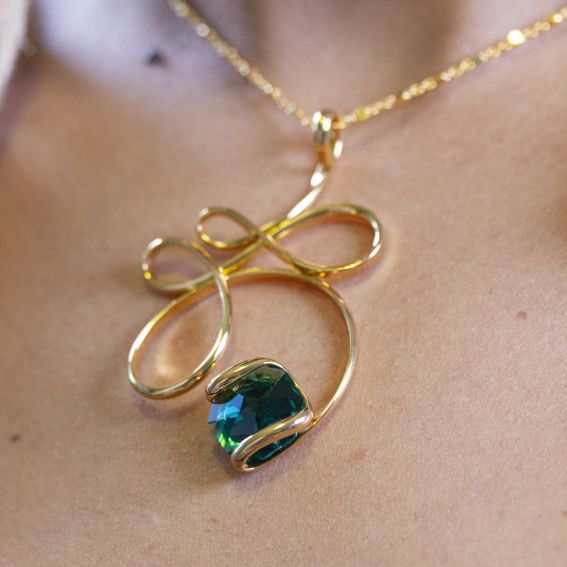 Deze Andrea Marazzini Octagon emerald Peony ketting , met een lengte van 45 cm, is een gouden model met een hanger van 62 mm. Het heeft een vloeiend en artistiek ontwerp, met een smaragdkleurig Swarovski-kristal.