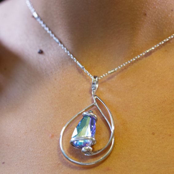 Dit kristal onderscheidt zich door de wisselende tinten blauw, paars en groen, die het licht prachtig opvangen. De delicate zilveren zetting omhult het kristal op subtiele wijze, waardoor de schittering centraal staat. Perfect om een vleugje verfijning en elegantie aan je outfit te geven.