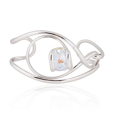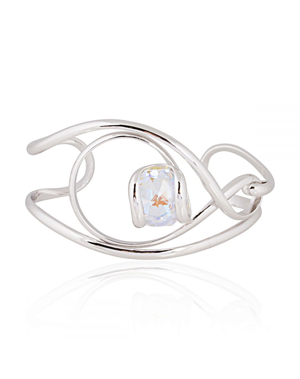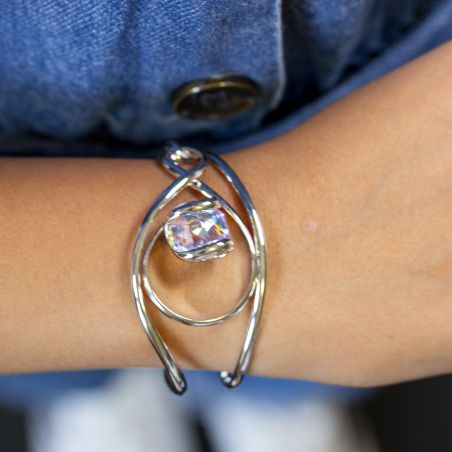 Het frame van deze armband is van zilverkleurig metaal met een strak en eigentijds design. De vloeiende, in elkaar verweven lijnen van het metaal creëren een open, organische vorm die het centrale kristal omlijst, wat een vleugje moderne elegantie toevoegt. Swarovski-kristal heeft een iriserende glans, met heldere, veelkleurige reflecties, die licht vanuit verschillende hoeken opvangen.