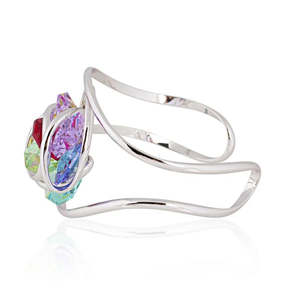Deze Andrea Marazzini Flower F43 Rio BR1-armband is voorzien van een veelkleurig Swarovski-kristal in de vorm van een bloem met een diameter van 34 mm. Het strakke ontwerp, met vloeiende, met elkaar verweven lijnen, benadrukt het levendige kristal met regenboogreflecties. Verstelbaar en lichtgewicht, het combineert elegantie en glans voor een unieke en verfijnde stijl.