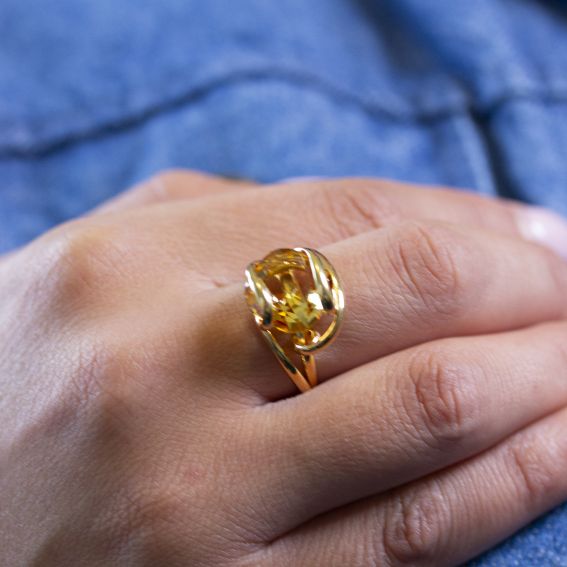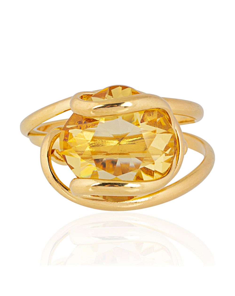 De setting heeft vloeiende, elegante lijnen die zich rond het kristal wikkelen, waardoor een verfijnd en verfijnd ontwerp ontstaat. De ring is verstelbaar, waardoor hij aangepast kan worden aan verschillende vingergroottes. Het is een helder en chic exemplaar, ideaal om een vleugje gouden glamour aan elke look toe te voegen.