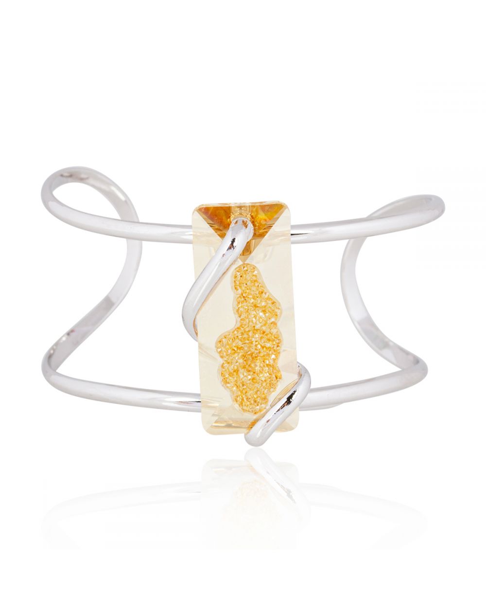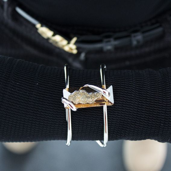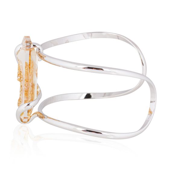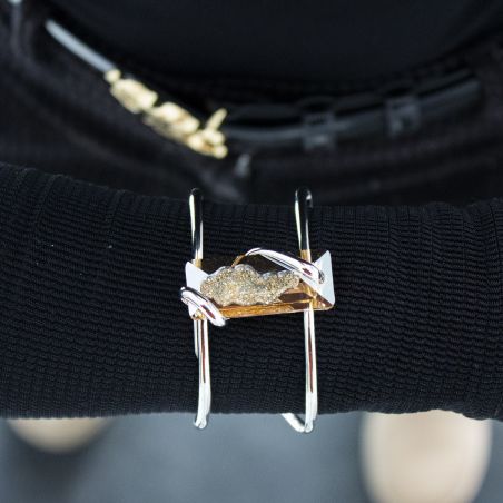 Ontdek de Andrea Marazzini Big Moondust Golden Shadow BR1-armband . Het Swarovski-kristal van 36 x 15 mm, in gouden tinten "Golden Shadow", wordt geaccentueerd door een elegant zilveren frame. Met zijn unieke en gedurfde ontwerp belichaamt deze armband perfect de balans tussen verfijning en originaliteit, ideaal om uw outfits te verbeteren.