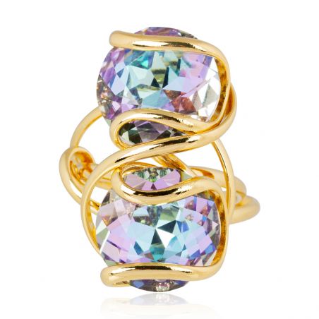 Ontdek de Andrea Marazzini Double Cherry Vitral Light-ring , versierd met twee Swarovski-kristallen van 14 mm. De veelkleurige highlights van de kristallen zijn prachtig ingelijst in een goudkleurige zetting. Deze gewaagde en elegante ring geeft een oogverblindend en verfijnd tintje aan je outfits, ideaal voor degenen die graag opvallen in stijl.