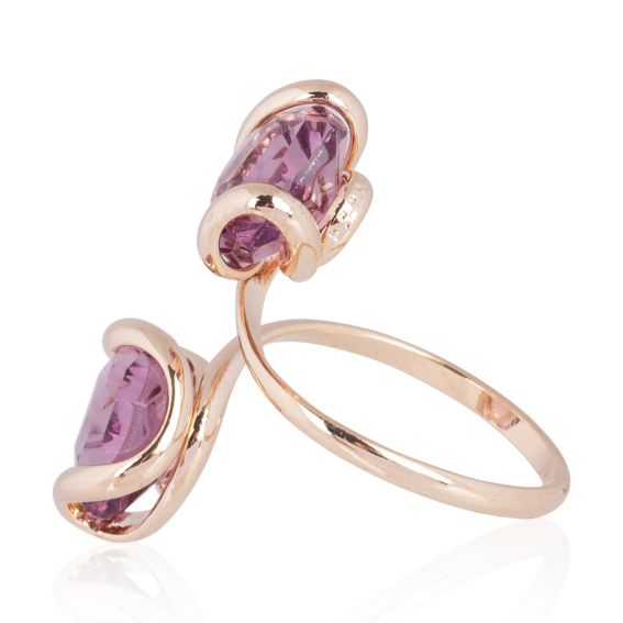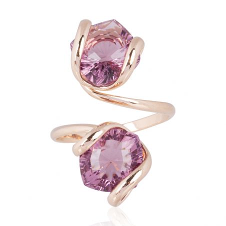 De twee kristallen, perfect gesneden om het licht op te vangen en te reflecteren, zijn verschoven geplaatst op een verstelbaar frame dat zich om de vinger wikkelt. Deze asymmetrische opstelling geeft de ring een onderscheidende stijl, met een opvallend visueel effect. Het roze metaal, gecombineerd met de paarse tinten van de kristallen, geeft dit sieraad een vleugje vrouwelijkheid en glamour.