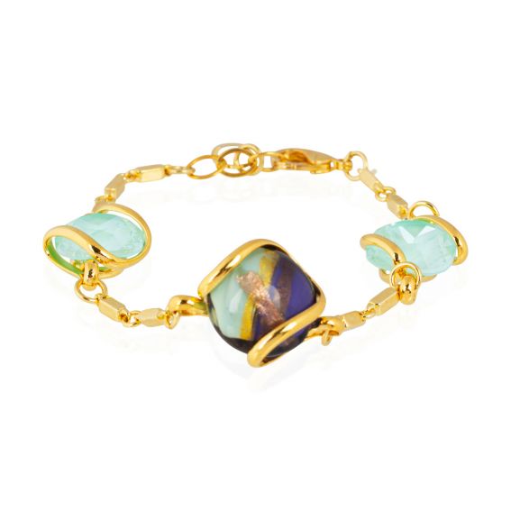 De Venice F5 MIA3 Swarovski-armband van Andrea Marazzini is een delicaat en luxueus stuk, dat tijdloze elegantie en artistiek design combineert. Deze armband bestaat uit drie prachtige Swarovski-stenen en onderscheidt zich door een subtiele harmonie van kleuren. De kristallen hebben gevarieerde tinten, waarbij levendig pastelgroen en diepblauw worden gemengd, versierd met glinsterende gouden highlights.