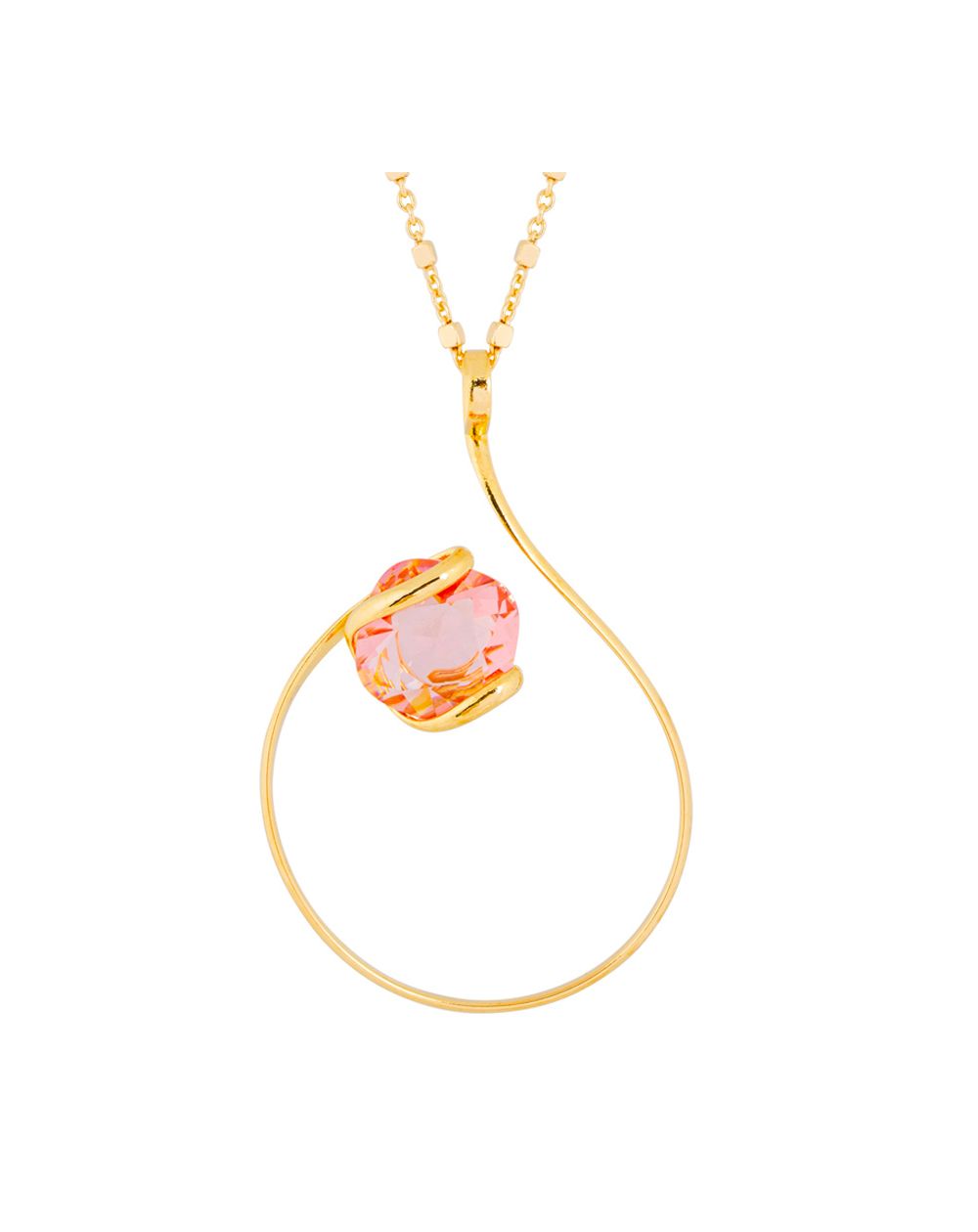 Het is gemaakt van goudkleurig metaal met een glinsterende afwerking en is voorzien van een prachtige Rose Peach Moon-steen, gezet in een gedraaide structuur die lijkt alsof hij lichtjes zweeft. De nauwkeurig gefacetteerde steen weerkaatst het licht vanuit verschillende hoeken, waardoor er een subtiel en warm sprankelend spel ontstaat.