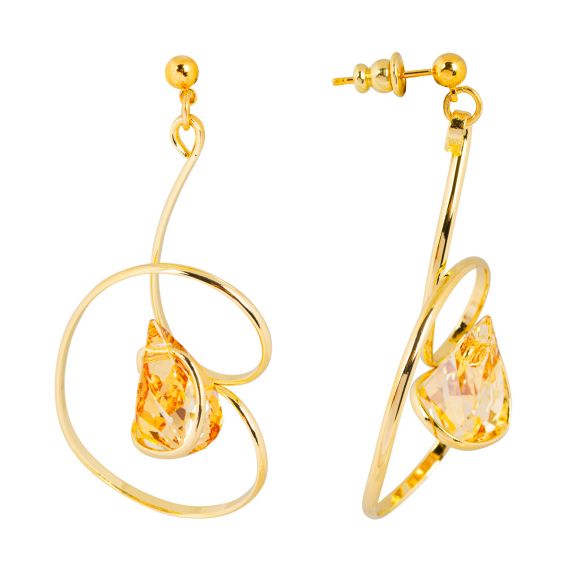Het gouden metalen ontwerp benadrukt een weelderig Swarovski Golden Shadow-kristal, geslepen in een gefacetteerde druppel. Dit kristal met warme, amberkleurige reflecties vangt het licht prachtig op en onthult glinsterende en elegante nuances. De steen is geplaatst in een gedraaide structuur die de steen lichtjes lijkt te omarmen. Hij zweeft in het hart van het juweel en creëert zo een opvallend effect van diepte en volume.