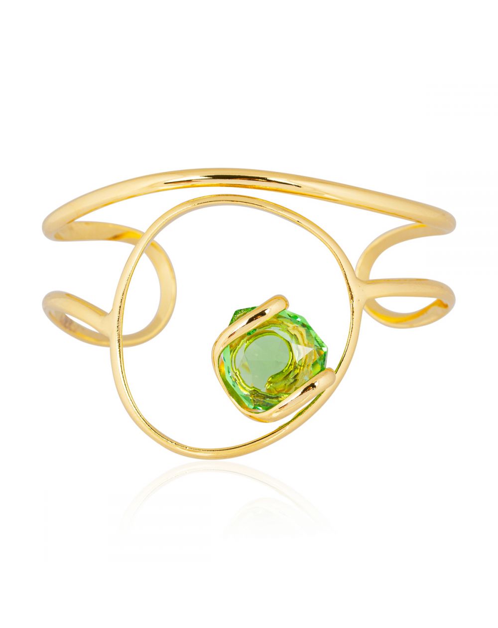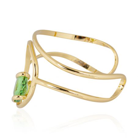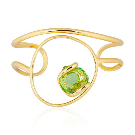 Laat u verleiden door deze gouden Marazzini-armband met zijn organische elegantie. Het 18 mm grote Swarovski Peridot-kristal met zijn levendige groene tinten reflecteert het licht intens. Het opengewerkte en verstelbare ontwerp maakt het een verfijnd en eigentijds sieraad, perfect om uw outfits mee te verfraaien.