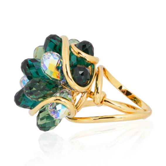 Laat u verleiden door de weelderige glans van deze Marazzini-ring , een unieke creatie van het huis Andrea Marazzini. Deze ring is een waar meesterwerk van vakmanschap en is voorzien van een weelderig boeket van diep smaragdgroene Swarovski-kristallen, subtiel gefacetteerd om licht te vangen en te reflecteren.