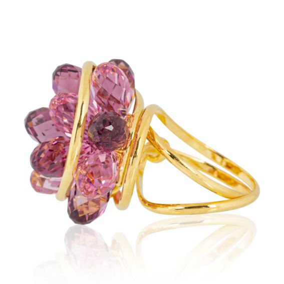 De Andrea Marazzini-ring is een uitzonderlijk sieraad dat verfijning en creativiteit combineert. Het is gemaakt van fijn verguld messing en versierd met een weelderig boeket Swarovski-kristallen, die nauwkeurig zijn geslepen om het licht te vangen en levendige tinten roze en paars te onthullen.