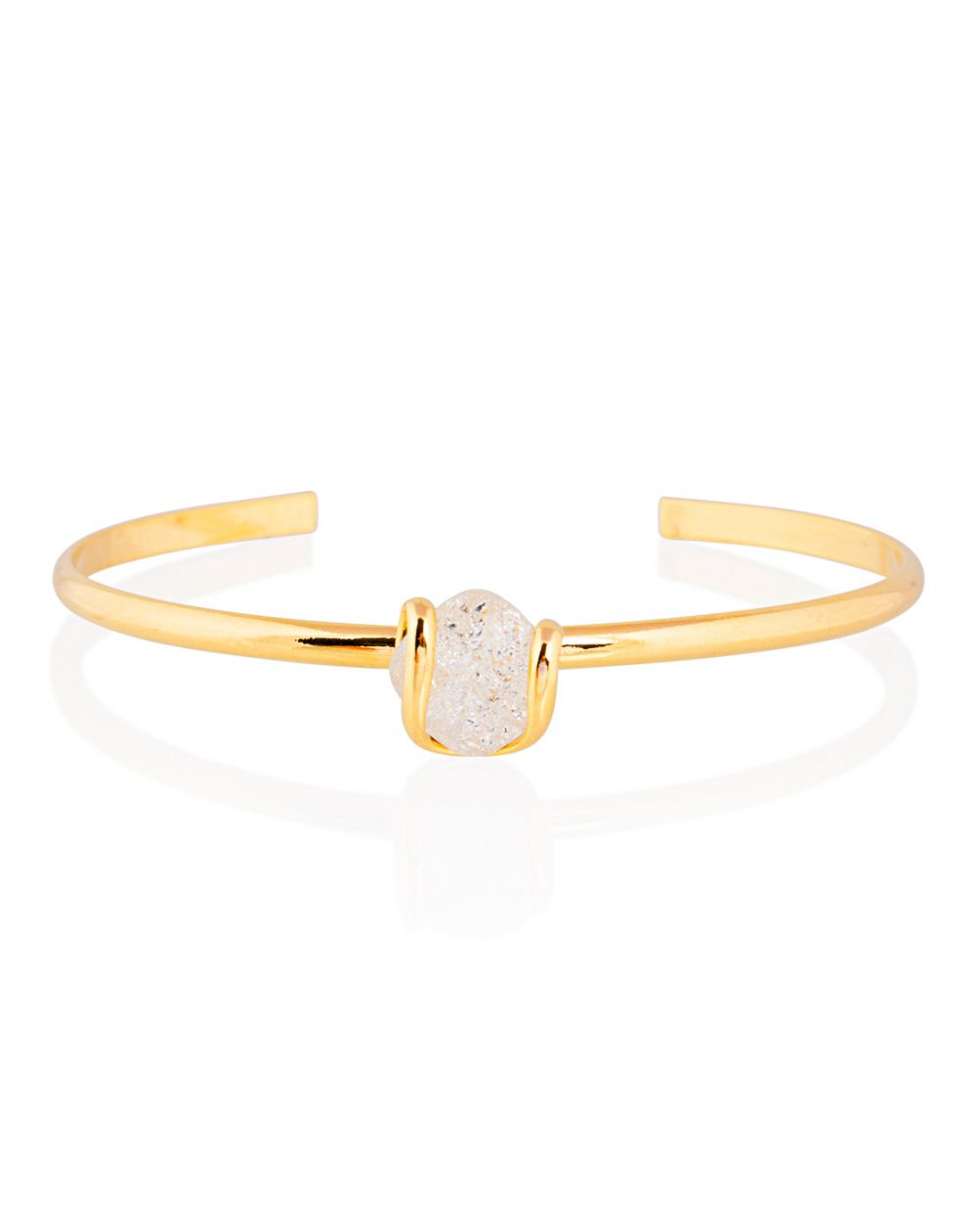 Dit minimalistische juweel is handgemaakt in Italië en bestaat uit een open frame van fijn verguld messing , versierd met een wit kristal met opaaleffect en een matte en lichtgevende uitstraling.
