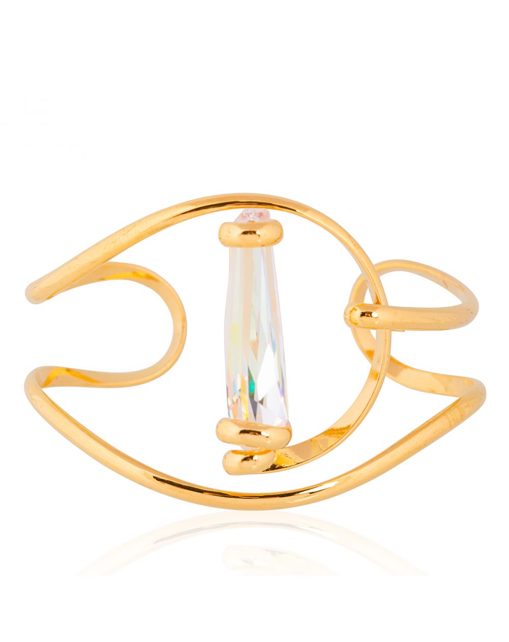 De grafische en vloeiende structuur creëert een delicate beweging rond de pols en benadrukt de verticaliteit van het kristal, geslepen als een stalactiet van licht. De iriserende reflecties van het kristal – oscillerend tussen roze, blauw en goud – creëren een uniek spel van schittering dat het licht vanuit elke hoek vangt.
